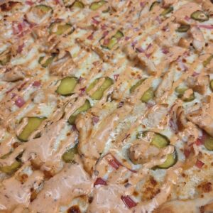 Breaded chicken bites tossed in BBQ sauce then topped with cheese and semi-sweet bacon